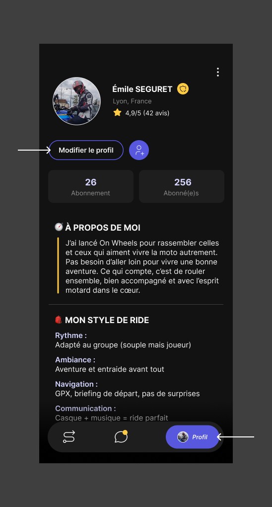 Vous souhaitez mettre à jour votre profil sur l’application On Wheels ? Rien de plus simple. Votre profil est votre carte d’identité motarde : il reflète votre style, vos envies de ride et facilite les connexions avec d'autres passionnés. Voici comment le modifier en quelques clics.