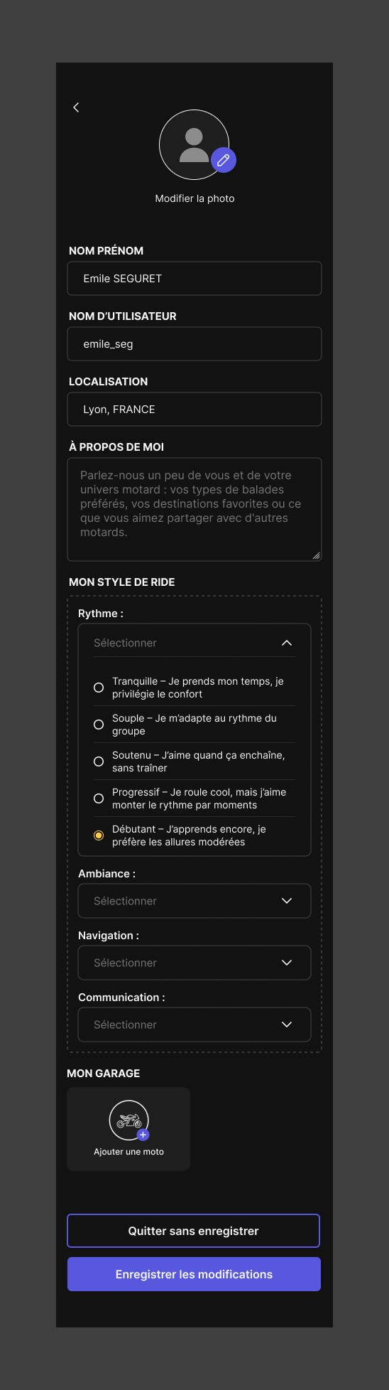 👉 Plus votre profil est complet et sincère, plus il sera facile pour les autres membres de la communauté de vous reconnaître, de se projeter avec vous et de partager des rides qui vous ressemblent.